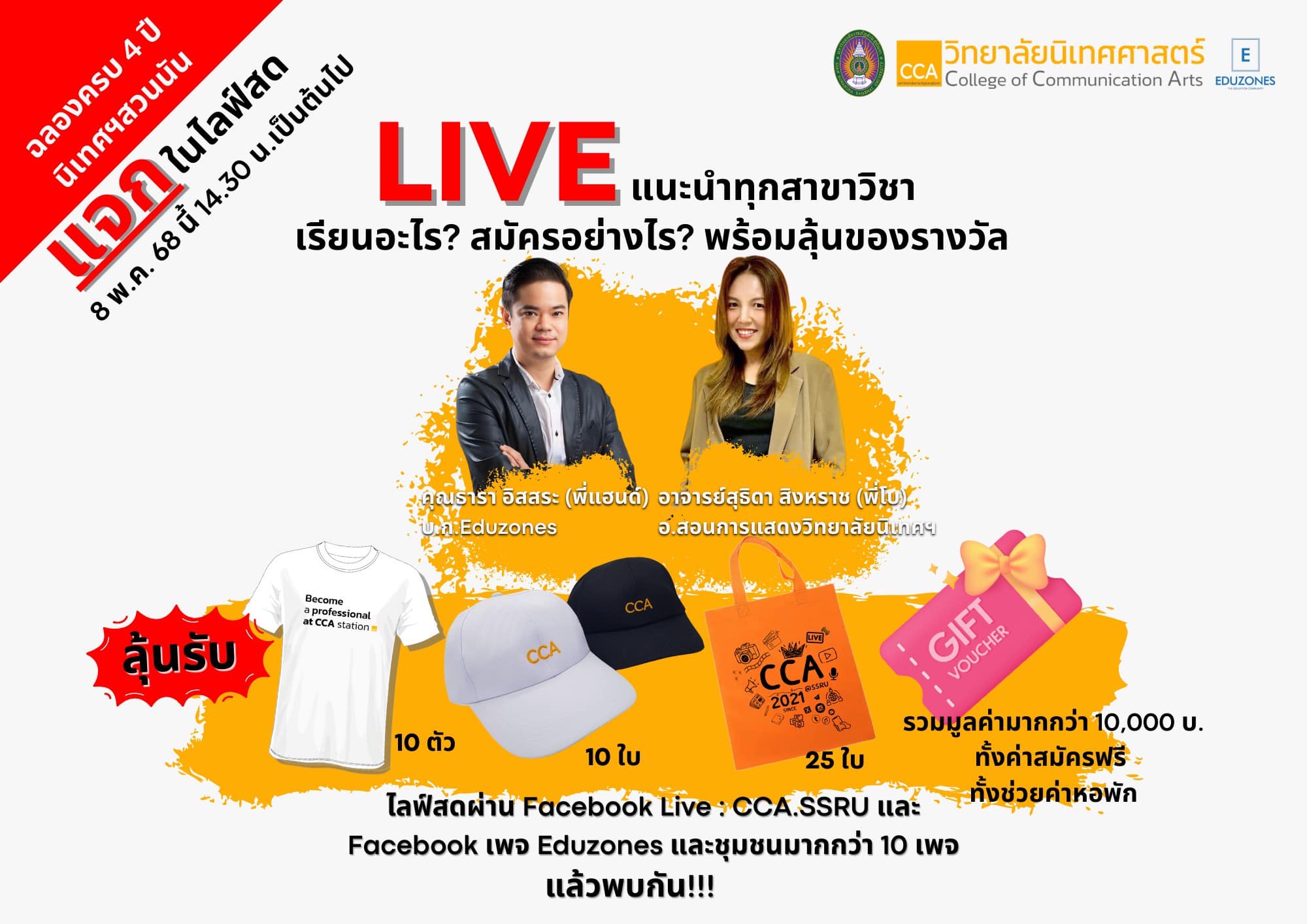 See you on May 8th. Recommended subjects/branches of interest from seniors in all fields of study!!!! Join Eduzone in Live. There will be a giveaway of 1,000 baht dorm fee coupons, 5 prizes, shirts, hats, and many souvenirs!!! Want to study communications? Come here from 2:30 PM onwards . #StudyCommunications #CollegeofCommunications