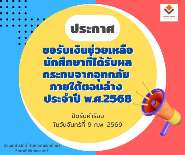 6. Copy of the bank account statement of the affected person. Submit documents to the Student Affairs Division, College of Communication Arts. The deadline for applications is Monday, February 9, 2026.