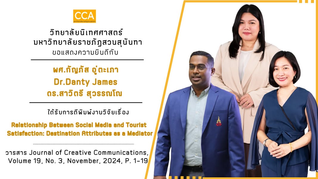The Faculty of Communication Arts published the Journal of Creative Communications, Volume 19, No. 3. Congratulations to Assistant Professor Kanphat Utapao, Dr. Danty James, and Lecturer Dr. Sawitree Suwanno for publishing the research paper Relationship Between Social Media and Tourist Satisfaction: Destination Attributes as a Mediator in the Journal of Creative Communications, Volume 19, No. 3, November, 2024, P. 1-19, Sage publisher database Scopus, SJR Q2, and WoS. Follow up on reading the research article at https://journals.sagepub.com/loi/crc.