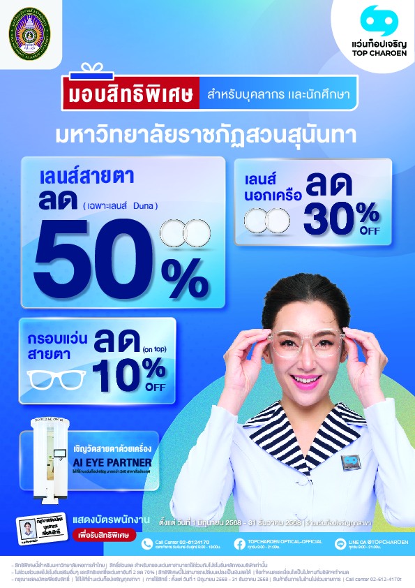 10% discount on prescription frames and eye exams using the AI EYE PARTNER machine. Just show your Suan Sunandha Rajabhat University employee card to receive special privileges at all Top Charoen Optical branches from June 1st - December 31st.