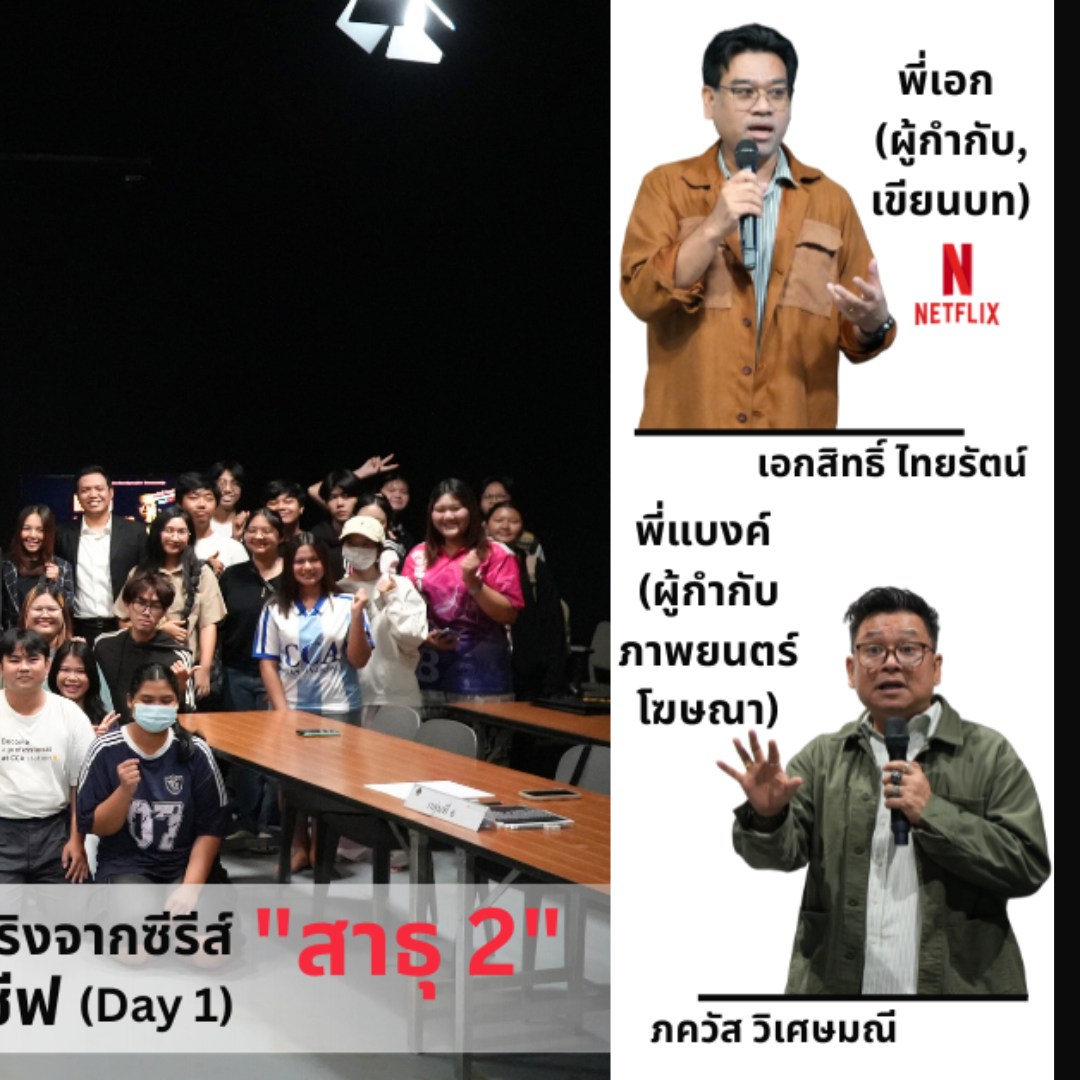 A golden opportunity awaits! The College of Communication Arts invites you to upgrade your skills with real professionals from the "Sathu" series! Meet P' Ek Ekkasit Thairat (director of "Pa Jit Lud" and Netflix scriptwriter for "Sathu 2," "Four Peaks," "Body of the Corpse 19," and many more) and P' Bank Pakkawat Wisemanee (film and advertising director, storyteller with a degree in Film New York) in an exclusive workshop: "Storytelling, Writing, and Directing Media in the Modern World."