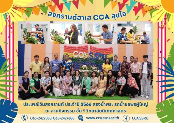 College of Communication Arts organize traditions to carry on Thai culture (Songkran Day) for the year 2023, with Asst. Prof. Dr. Komsan Somanawat, Vice President for Nakhon Pathom Campus as the president, along with Asst. pouring water on adults Pray for happiness, fulfillment and good luck on the occasion of the Thai New Year at the activity area on the 1st floor of the College of Communication Arts.
