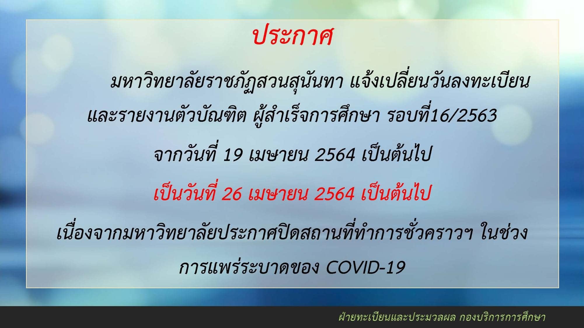 ***แจ้งเปลี่ยนการลงทะเบียนและรายงานตัวบัณฑิต เพื่อรับเอกสารสำคัญทางการศึกษา ประจำปีการศึกษา 2562-2563 รอบที่ 16/2563 ตรวจสอบผลสำเร็จการศึกษา ที่ reg.ssru.ac.th ***