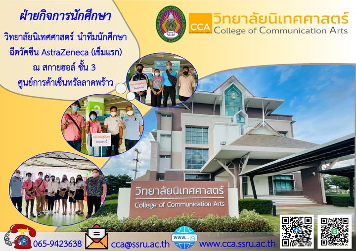 เมื่อวันที่ 30 มิ.ย. 64 เวลา 13.00 น. ดร.บัญยง พูลทรัพย์ รักษาราชการแทนรองคณบดีฝ่ายกิจการนักศึกษา พร้อมด้วยบุคลากร วิทยาลัยนิเทศศาสตร์ นำทีมนักศึกษาทุกชั้นปีวิทยาลัยนิเทศศาสตร์เข้ารับการฉีดวัคซีนของนักศึกษามหาวิทยาลัยราชภัฏสวนสุนันทา เพื่อความปลอดภัยและเป็นไปตามมาตรการป้องกันการแพร่ระบาดของเชื้อไวรัสโคโรน่า (Covid-19) ของมหาวิทยาลัยราชภัฏสวนสุนันทา โดยฉีดวัคซีน AstraZeneca (เข็มแรก) ณ สกายฮอล์ ชั้น 3 ศูนย์การค้าเซ็นทรัลลาดพร้าว