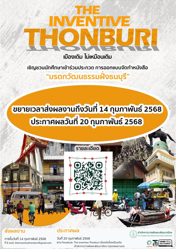 สำนักการวางผังและพัฒนาเมือง กรุงเทพมหานคร เชิญชวนนักศึกษาเข้าร่วมประกวดการจัดทำหนังสือ “มรดกวัฒนธรรมฝั่งธนบุรี” ภายใต้โครงการจ้างที่ปรึกษาวางผังปรับปรุงฟื้นฟูเมืองเพื่อเพิ่มศักยภาพการใช้พื้นที่ และส่งเสริมเศรษฐกิจระดับย่านในพื้นที่ เขตเมืองเก่าฝั่งธนบุรี