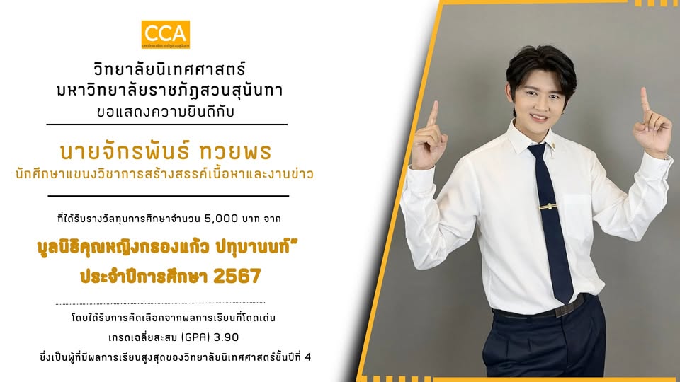วิทยาลัยนิเทศศาสตร์ ขอแสดงความยินดีกับ นายจักรพันธ์ ทวยพร นักศึกษาชั้นปี 4 แขนงวิชาการสร้างสรรค์เนื้อหาและงานข่าว ได้รับการคัดเลือกเพื่อรับทุนการศึกษาจำนวน 5,000 บาท จาก “มูลนิธิคุณหญิงกรองแก้ว ปทุมานนท์” ประจำปีการศึกษา 2567 ซึ่งเป็นทุนที่มอบให้แก่นักศึกษาที่มีผลการเรียนยอดเยี่ยมในระดับมหาวิทยาลัยปีสุดท้ายของแต่ละคณะ โดยในปีนี้ นายจักรพันธ์ ได้รับการคัดเลือกจากผลการเรียนที่โดดเด่น ด้วยเกรดเฉลี่ยสะสม (GPA) 3.90 ซึ่งเป็นผู้ที่มีผลการเรียนสูงสุดของวิทยาลัยนิเทศศาสตร์ชั้นปีที่ 4