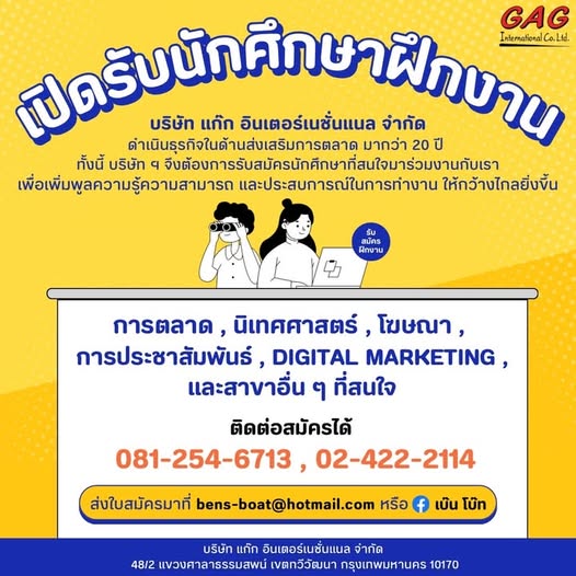 บริษัท แก๊ก อินเตอร์เนชั่นแนล จำกัด ผู้ผลิตรายการเบ๊น+โบ๊ท เปิดรับนักศึกษาที่สนใจ