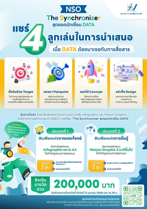 ขอเชิญนักเรียน นักศึกษา และผู้ที่สนใจเข้าร่วมกิจกรรมการประกวดสื่อ Infographic และสื่อ Motion Graphic การนําข้อมูลสถิติไปใช้ประโยชน์ โดยสำนักงานสถิติแห่งชาติ (NSO) ภายใต้ธีม “The Synchronizer สุดยอดนักเชื่อม Data” โชว์พลังสร้างสรรค์ เชื่อมโยงข้อมูลให้เข้าใจง่าย สไตล์ไม่ซ้ำใคร ชิงเงินรางวัลรวมกว่า 200,000 บาท