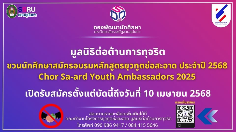 มูลนิธิต่อต้านการทุจริต กำหนดเปิดสมัครนิสิต นักศึกษาระดับอุดมศึกษา และระดับประกาศนียบัตรวิชาชีพชั้นสูง (ปวส.) ทั่วประเทศเข้าร่วมโครงการอบรมหลักสูตรยุวทูตช่อสะอาด ประจำปี 2568 (Chor Sa-ard Youth Ambassadors 2025) กำหนดรับสมัครตั้งแต่บัดนี้ถึงวันที่ 10 เมษายน 2568