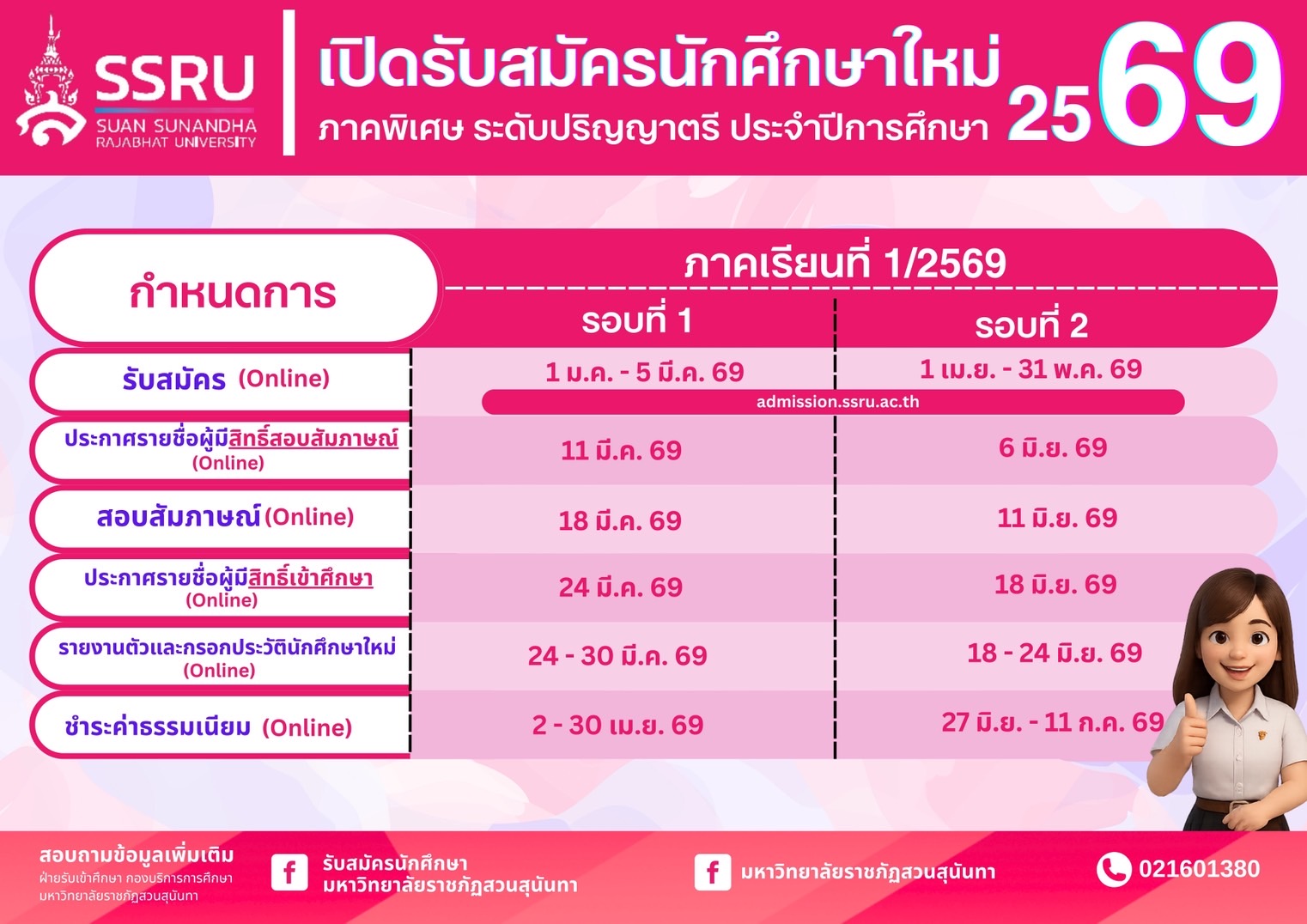 กำหนดการรับสมัครนักศึกษา ระดับปริญญาตรี (ภาคพิเศษ) ปีการศึกษา 2569 มหาวิทยาลัยราชภัฏสวนสุนันทา