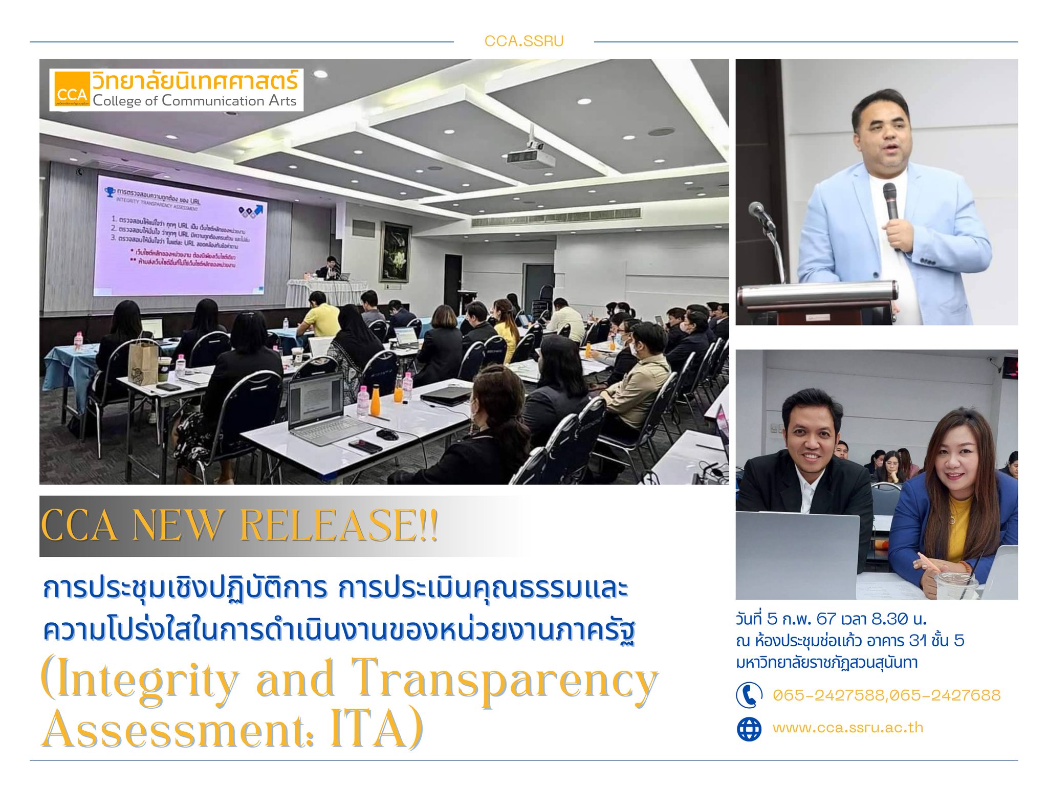 เมื่อวันที่ 5 ก.พ. 67 เวลา 08.30 น.  ดร.สมทบ  แก้วเชื้อ รองคณบดีฝ่ายบริหาร ร่วมด้วยหัวหน้าฝ่ายบริหารงานทั่วไป เข้าร่วมโครงการอบรมคุณธรรม จริยธรรม และความโปร่งใส “การประเมิน ITA ประจำปีงบประมาณ พ.ศ. 2567” โดยมี ผศ.ดร.คมสัน โสมณวัตร รองอธิการบดีฝ่ายบริหาร เป็นประธานกล่าวเปิดงาน จัดโดยกองกลาง สำนักงานอธิการบดี ณ ห้องประชุมช่อแก้ว อาคาร 31 ชั้น 5 มหาวิทยาลัยราชภัฏสวนสุนันทา
