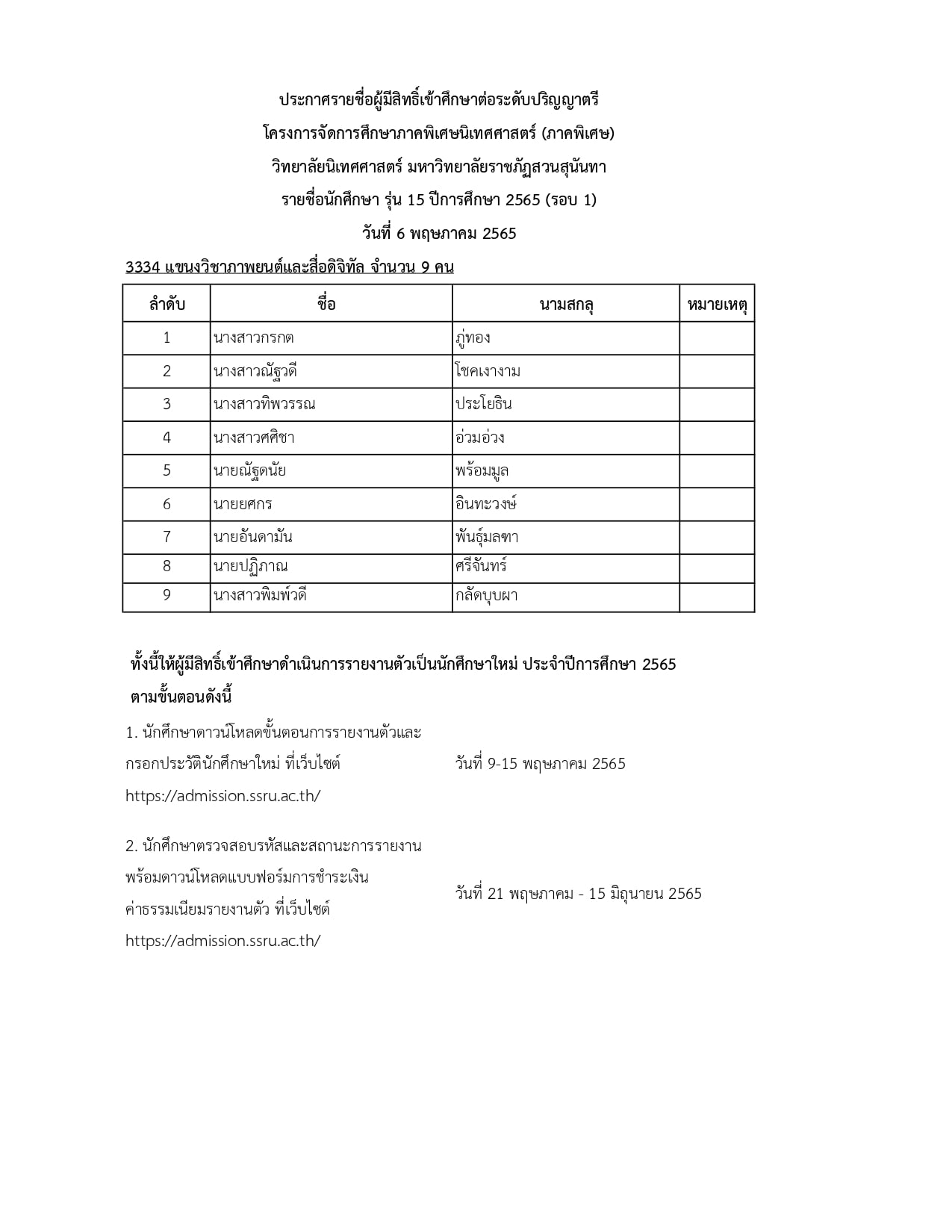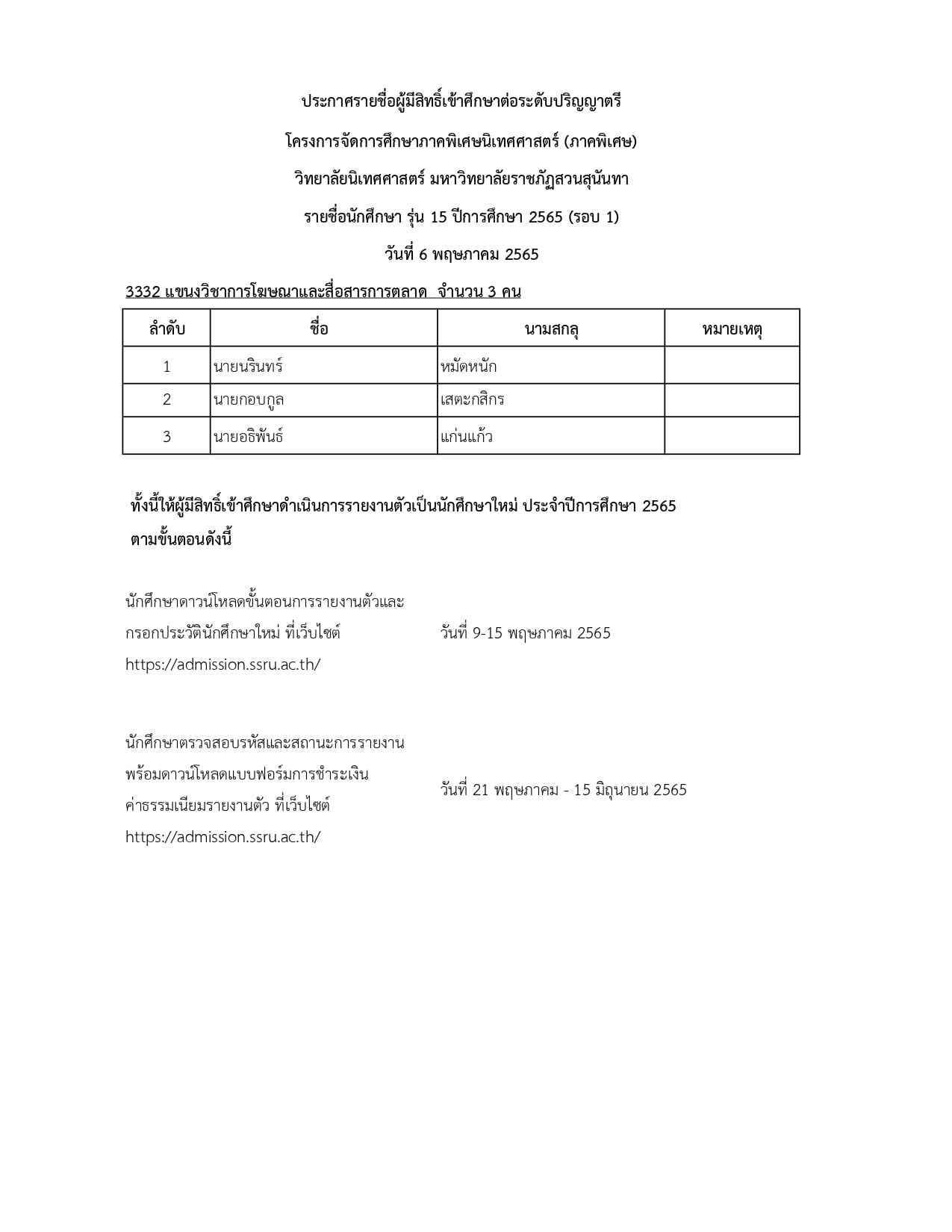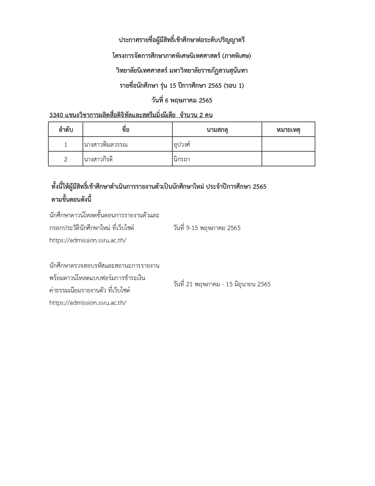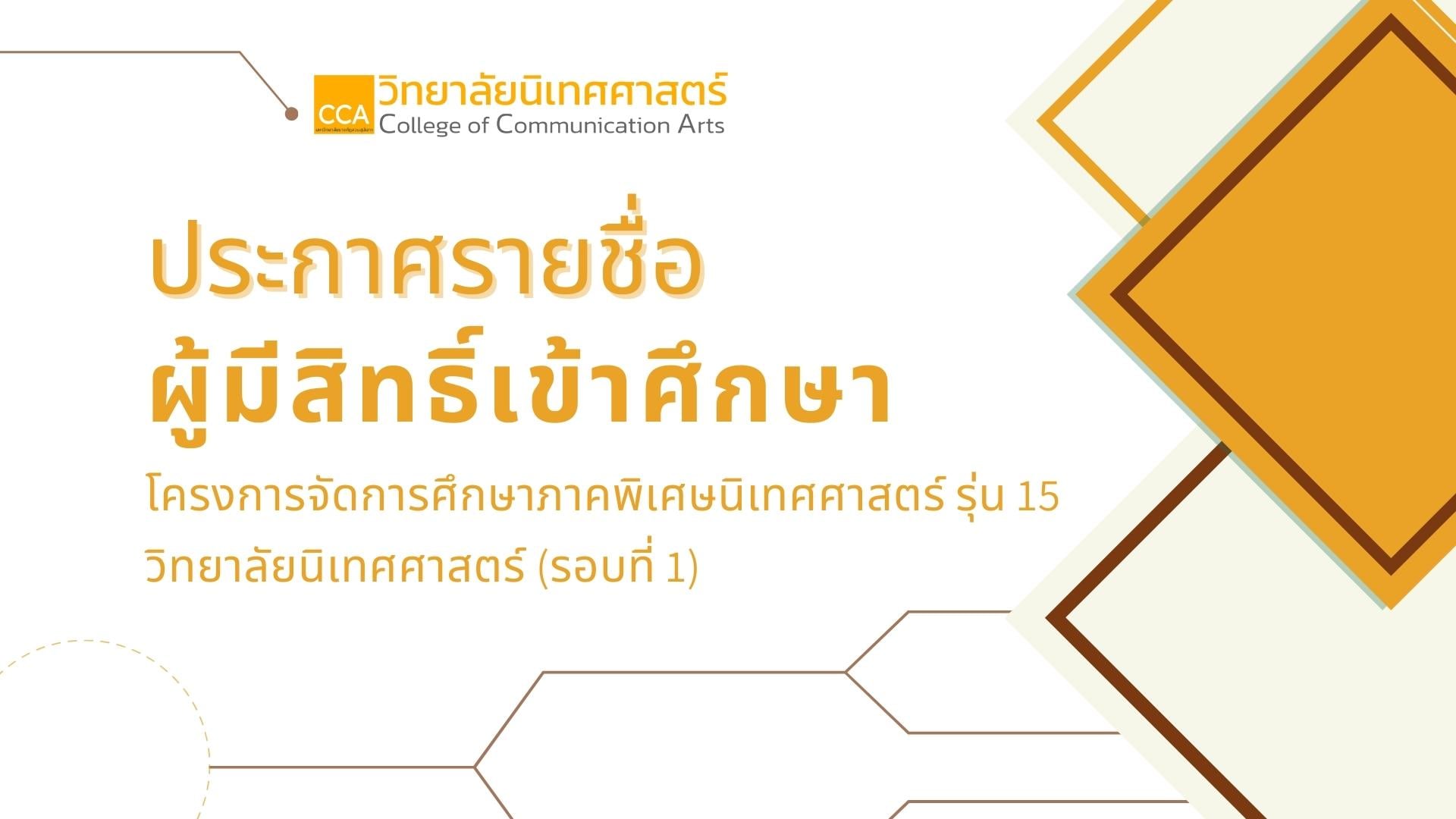 ประกาศรายชื่อผู้มีสิทธิ์เข้าศึกษาโครงการจัดการศึกษาภาคพิเศษนิเทศศาสตร์