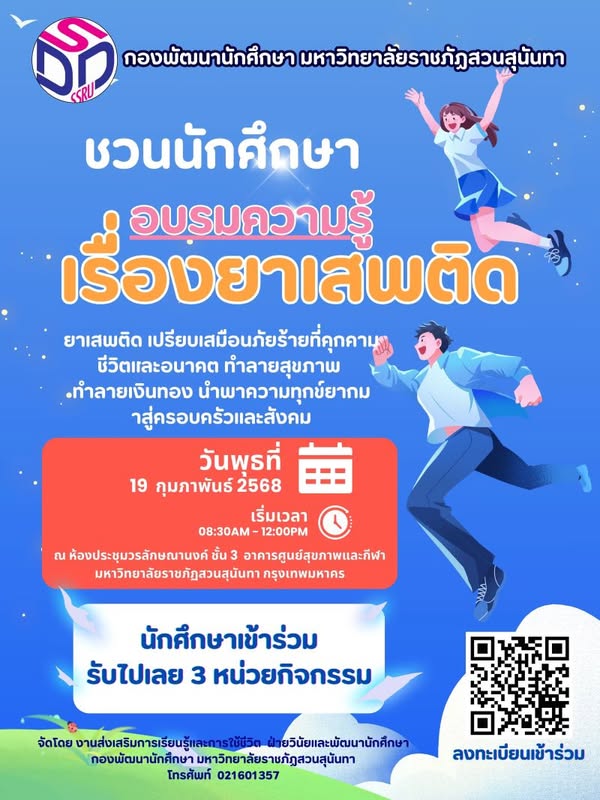 มหาวิทยาลัยราชภัฏสวนสุนันทา โดย กองพัฒนานักศึกษา ฝ่ายวินัยและพัฒนานักศึกษา งานส่งเสริมการเรียนรู้และการใช้ชีวิต ร่วมกับ สำนักงานคณะกรรมการป้องกันและปราบปรามยาเสพติด จัดอบรมให้ความรู้เรื่อง ยาเสพติด ในวันพุธที่ 19 กุมภาพันธ์ 2568 เวลา 08.30 – 12.00 น. ณ ห้องประชุมวรลักษณานงค์ ชั้น 3 อาคารศูนย์สุขภาพและกีฬาสวนสุนันทา กรุงเทพมหานคร