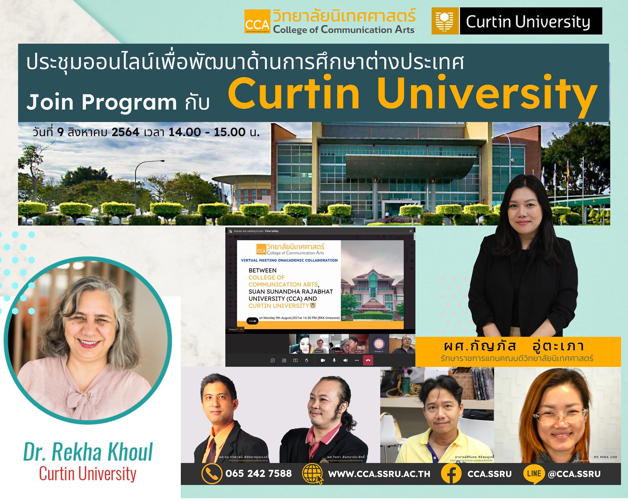 Curtin University ประเทศออสเตรเลีย..สิงคโปร์ และมาเลเซีย โดยมี ผศ.ดร.ทวิพาสน์ พิชัยชาญณรงค์ (รักษาราชการแทนรองคณบดีฝ่ายบริหาร) ดำเนินการประชุม ร่วมด้วย ,ผศ.วิชชา  สันทนาประสิทธิ์ (รักษาราชการแทนรองคณบดีฝ่ายวิชาการ)และ อาจารย์ศิริเดช  ศิริสมบูรณ์ (หัวหน้าสาขาวิชาการสร้างสรรค์และสื่อดิจิทัล หลักสูตรนานาชาติ) เข้าร่วมการประชุม กับผู้แทนจาก CURTIN UNIVERSITY  ผ่านระบบออนไลน์