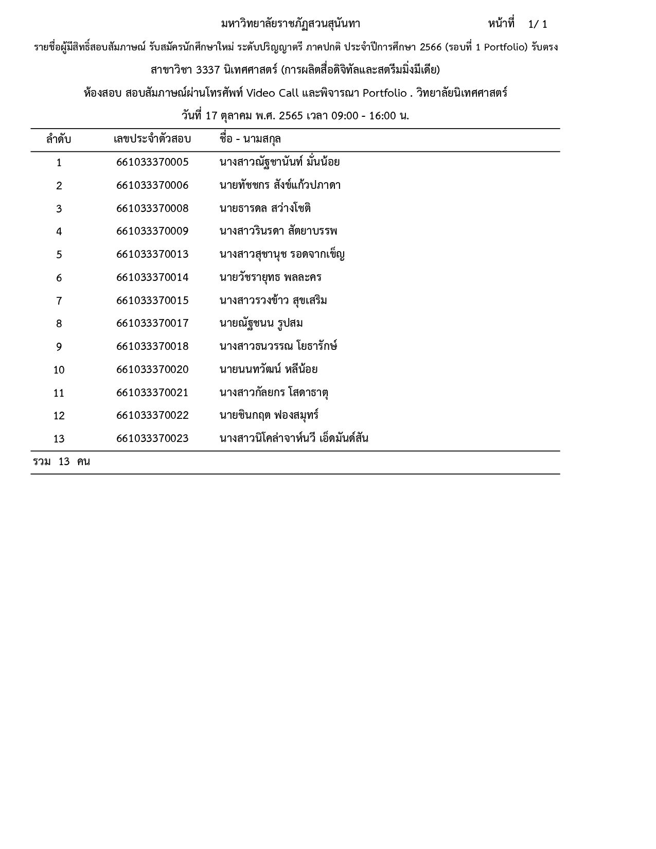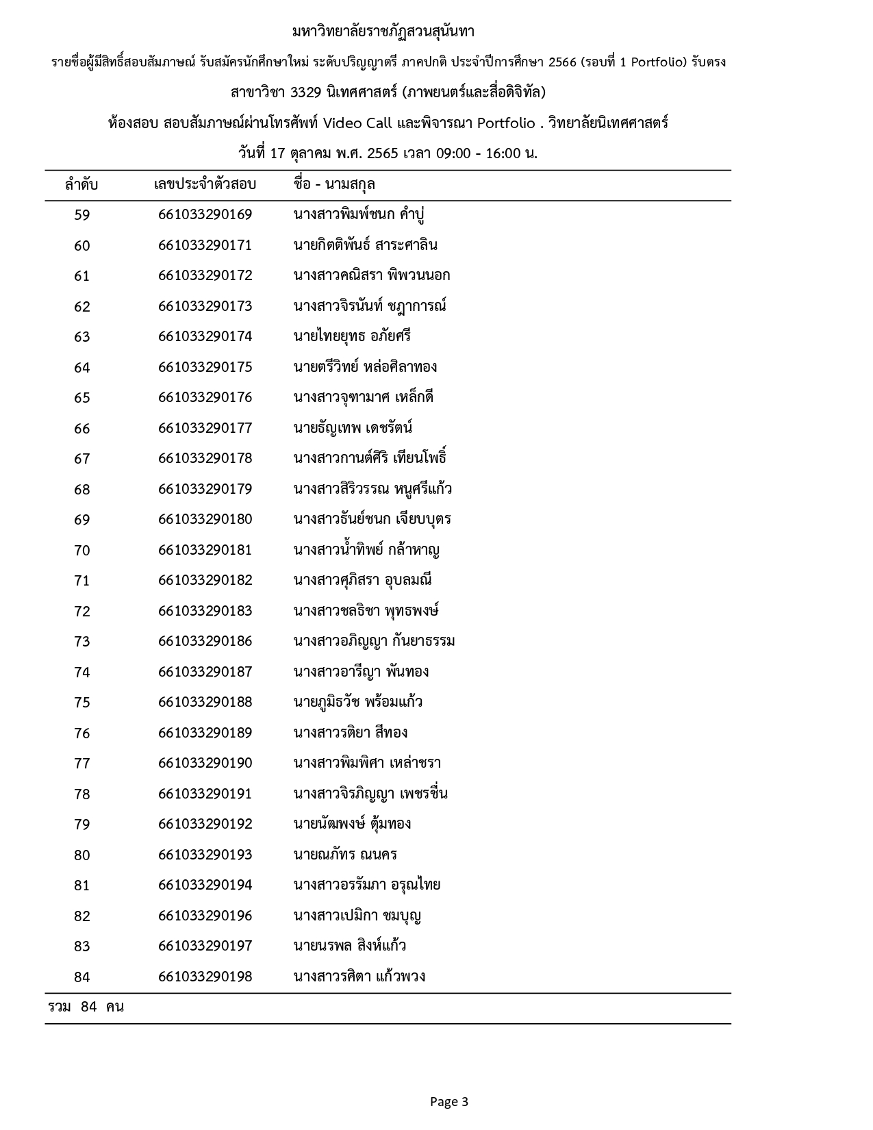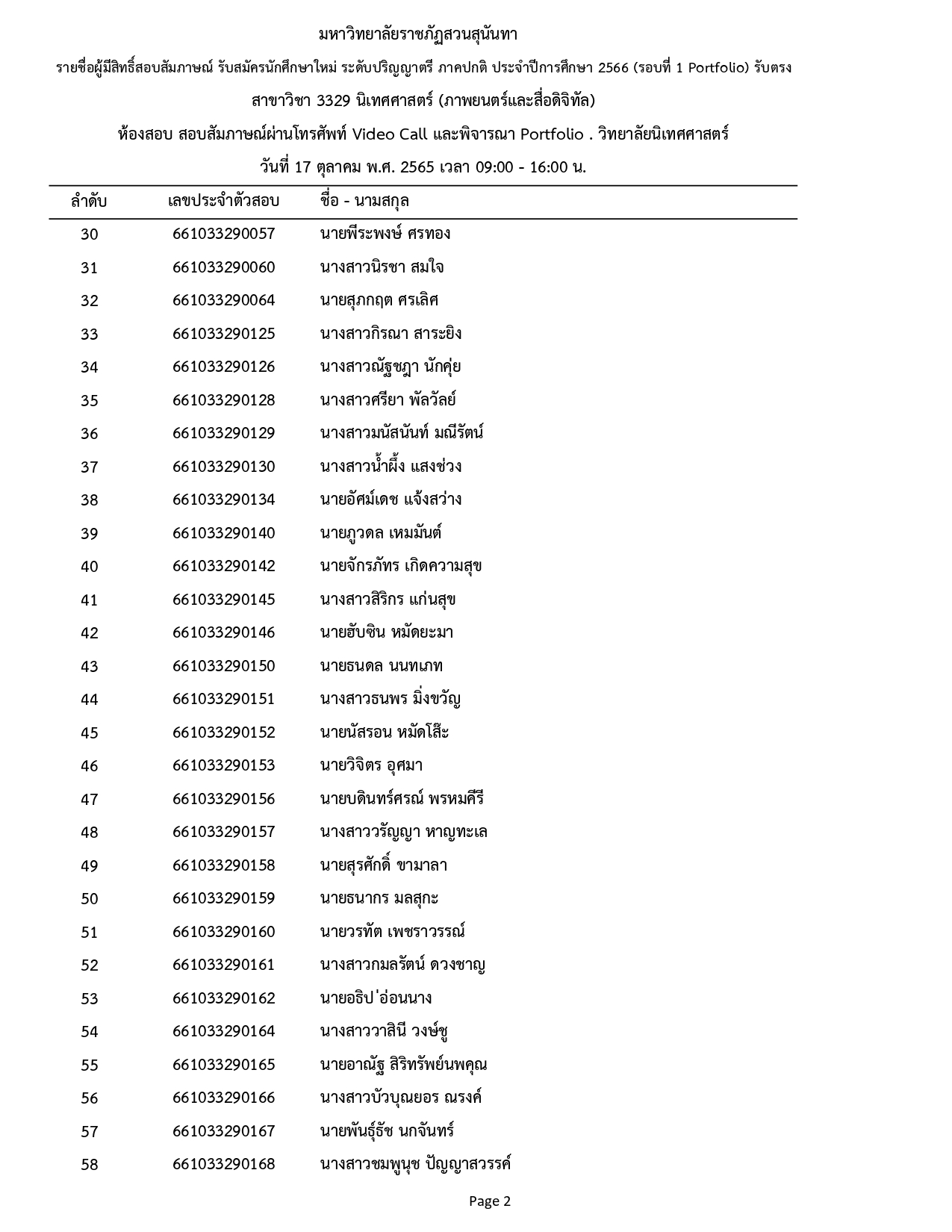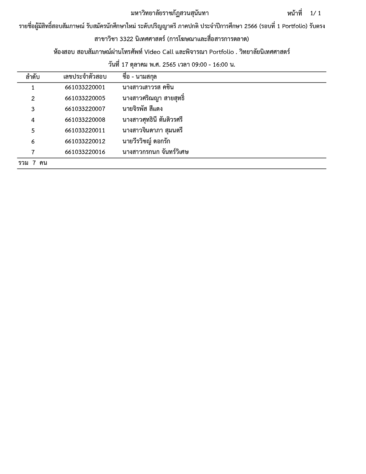 ประกาศรายชื่อผู้มีสิทธิ์สอบสัมภาษณ์ รอบที่ 1 (Portfolio) รับตรง ประจำปีการศึกษา 2566 โดยสอบสัมภาษณ์ทาง VDO CALL