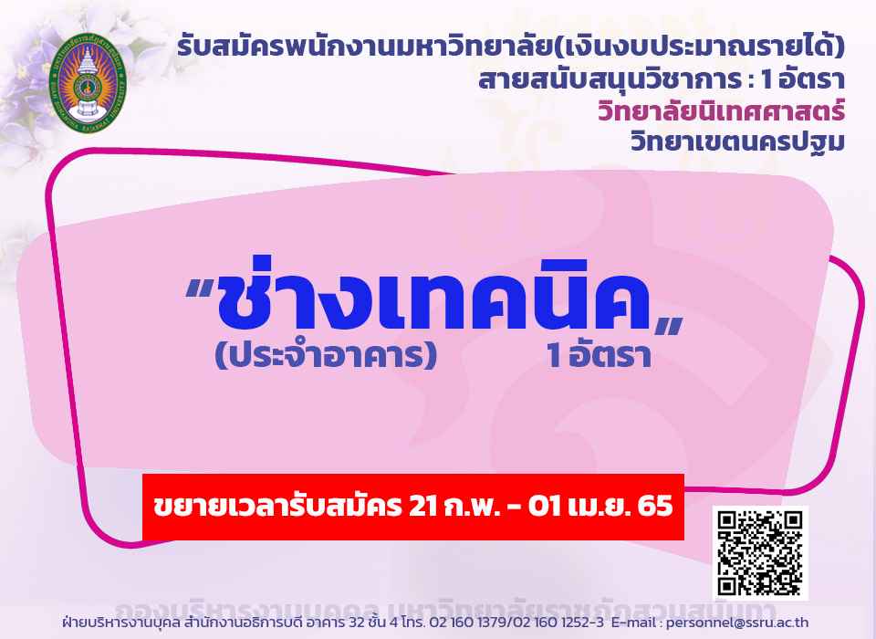 ประกาศรับสมัคร ช่างเทคนิค (ประจำอาคาร) 1 อัตรา ตั้งแต่วันที่ 21 ก.พ. - 1 เม.ย. 65 สังกัดวิทยาลัยนิเทศศาสตร์ วิทยาเขตนครปฐม