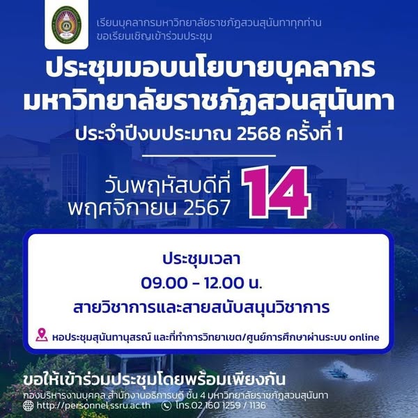 วันพฤหัสบดีที่ 14 พฤศจิกายน พ.ศ. 2567 มหาวิทยาลัยราชภัฏสวนสุนันทาประชุมบุคลากร มหาวิทยาลัยราชภัฏสวนสุนันทา ประจำปีงบประมาณ 2568 ครั้งที่ 1 เพื่อมอบนโยบายแนวทางการขับเคลื่อนมหาวิทยาลัยให้ไปในทิศทางเดียวกัน โดยคณะผู้บริหาร นำโดย รองศาสตราจารย์ ดร.ฤๅเดช เกิดวิชัย นายกสภามหาวิทยาลัย ในประเด็น การนำนโยบายมหาวิทยาลัยสู่การปฏิบัติ “เราจะต้องเตรียมพร้อมกันอย่างไร” และรองศาสตราจารย์ ดร.ชุติกาญจน์ ศรีวิบูลย์ อธิการบดี ในประเด็น สวนสุนันทา ก้าวสู่มหาวิทยาลัยดิจิทัลอย่างเต็มรูปแบบ ซึ่งมีบุคลาการทั้งสายสนับสนุนวิชาการและสายวิชาการเข้าร่วมรับฟังนโยบาย ณ  อาคารศูนย์สุขภาพและกีฬา  ชั้น 4 และผ่านระบบออนไลน์ในส่วนของวิทยาเขตและศูนย์การศึกษา