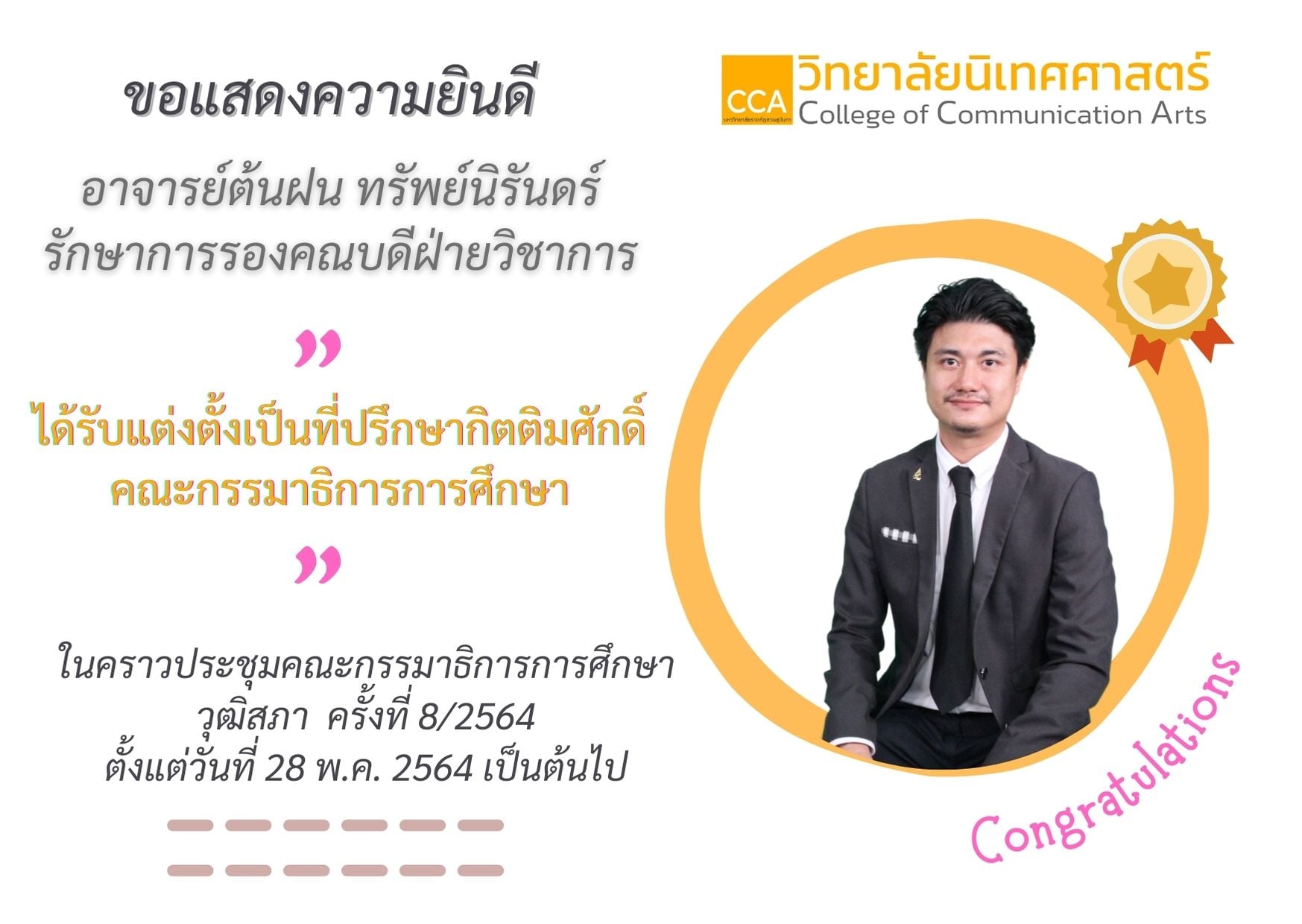 วิทยาลัยนิเทศศาสตร์ ขอแสดงความยินดีกับ อาจารย์ต้นฝน ทรัพย์นิรันดร์ รักษาราชการแทนรองคณบดีฝ่ายวิชาการ ได้รับการแต่งตั้งเป็นที่ปรึกษากิตติมศักดิ์ คณะกรรมาธิการการศึกษา