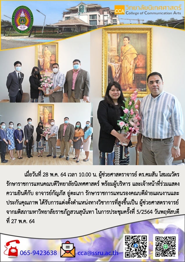 แสดงความยินดีกับ อาจารย์กัญภัส อู่ตะเภา รักษาราชการแทนรองคณบดีฝ่ายแผนงานและประกันคุณภาพ ได้รับการแต่งตั้งตำแหน่งทางวิชาการที่สูงขึ้นเป็น ผู้ช่วยศาสตราจารย์