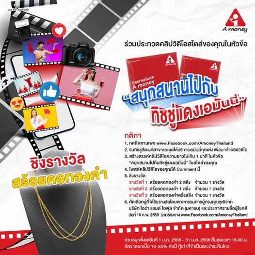โพส์ตคลิปเข้าร่วมประกวดได้ที่ www.Facebook.com/AmoneyThailand ตั้งแต่ วันที่ 1 – 31 มกราคม 2568 (เวลา 18.00 น.) พร้อมประกาศรายชื่อผู้ได้รับรางวัล ในวันที่ 10 กุมภาพันธ์ 2568