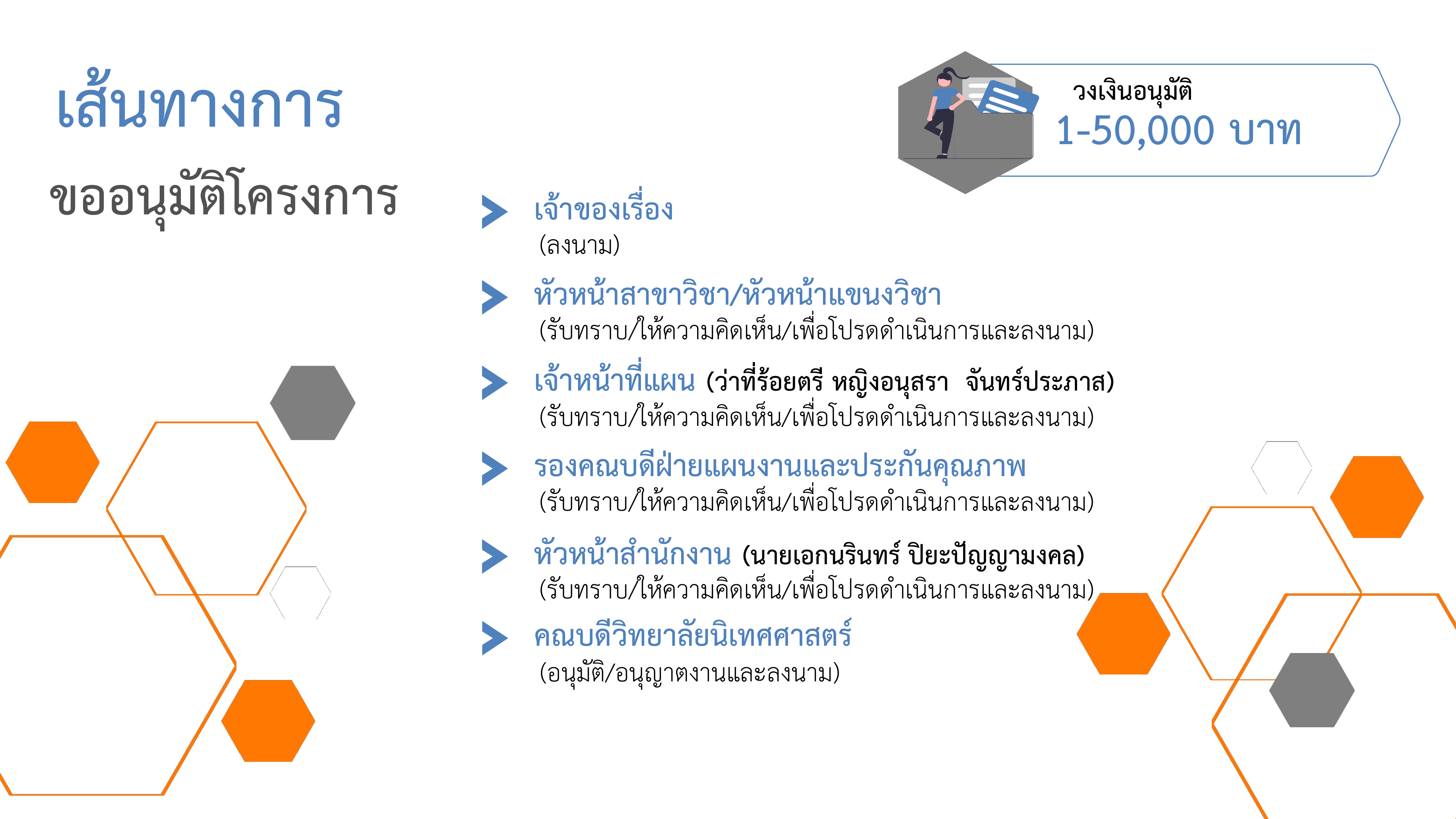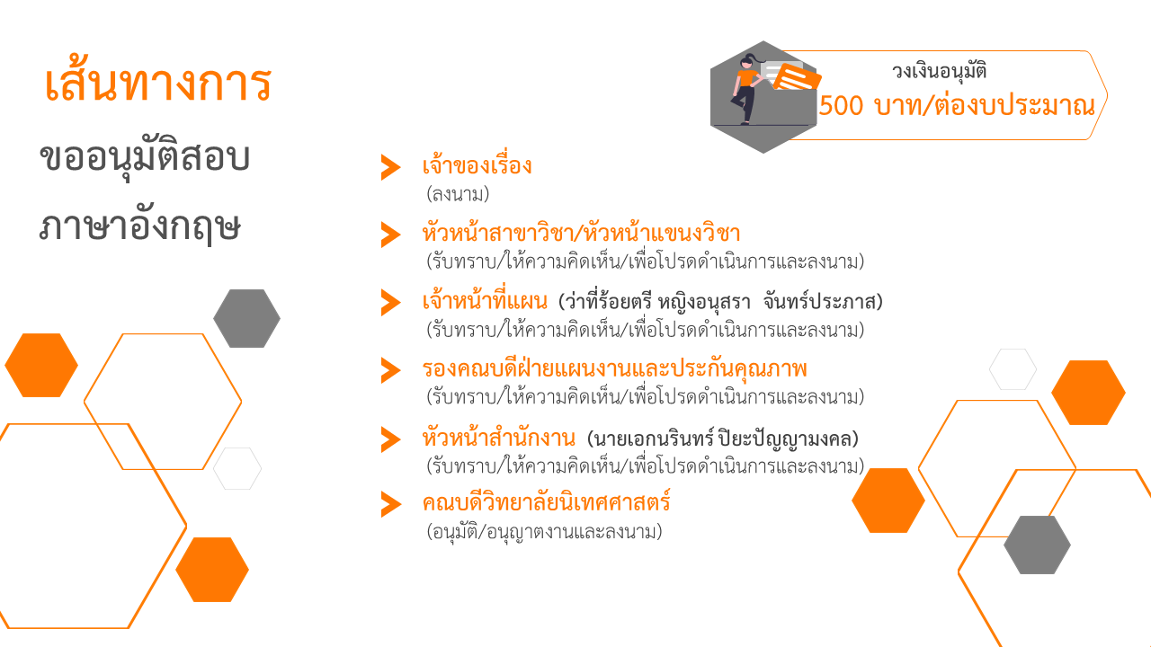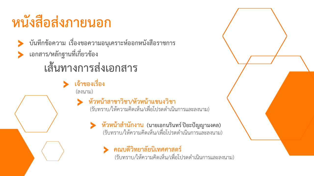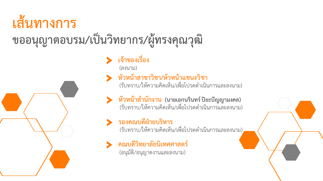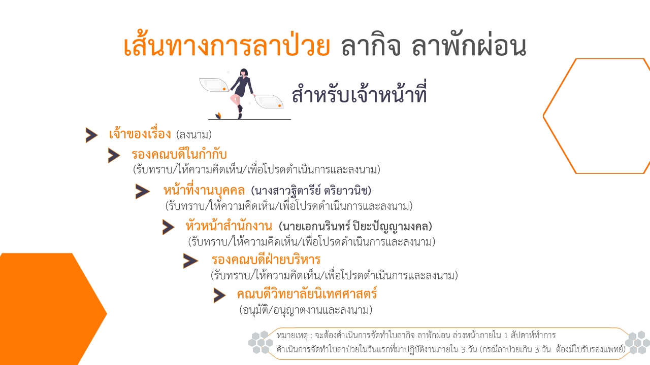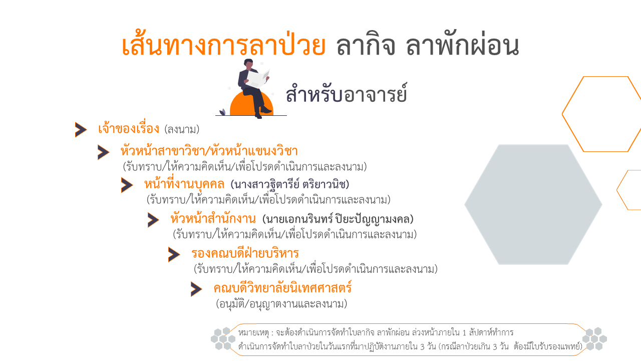 เส้นทางการส่งเอกสารภายในหน่วยงาน หนังสือภายนอก - ภายในลาป่วย - ลากิจ - ลาพักผ่อน (อาจารย์)ลาป่วย - ลากิจ - ลาพักผ่อน (เจ้าหน้าที่)The path of sending books outside - insidPath of sick leave, business leave, vacation leave (teachers)Path of sick leave, business leave, vacation leave (officers)ขออนุมัติสอบภาษาอังกฤษขออนุญาตอบรม/เชิญเป็นวิทยากร/ผู้ทรงคุณวุฒิขออนุมัติโครงการ งบ 1 - 50,000 บาทEnglish language test approval routeRoutes for obtaining permission for training/speakers/specialistsProject Approval Path