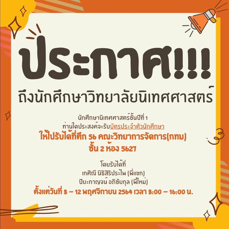 Any 1st year communication arts student who wishes to receive a student ID card Can pick up at Building 56, Faculty of Management Science (Bangkok), 2nd floor, room 5627, by picking up at Kesinee Nithisiripraphai (Pe Khaek) or Piyakan Aphichaikul (Pe Mai) from 8-12 Nov. 64 from 8:00 a.m. to 4:00 p.m.