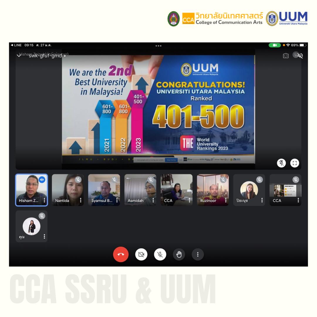 On January 30, 2023, from 9:00 a.m. to 11:00 a.m. led by Ajarn Dr. Sop Kaewchuea, Deputy Dean for Administration and Ajarn Dr. Sawitree Suwanno, Deputy Dean for Planning and Quality Assurance, and Ajarn Dr. Nantida Othakam, lecturer in the department. Public Relations and Strategic Communication Collaboration Meeting with Universiti Utara Malaysia by Dr.Hisham Zainal,Dean and Dr. Syamsul Bahrin Zaibon,Deputy Dean Academic and Dr. Ruzinoor Che Mat ,Director of CoE and Dr. Asmidah binti Alwi,Deputy Dean Student Affairs joins an online meeting to plan joint operations in fiscal year 2023.