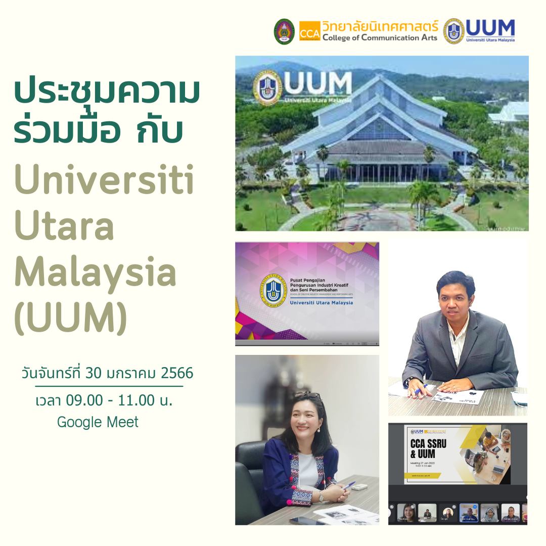 เมื่อวันที่ 30 มกราคม 2566 เวลา 9.00 - 11.00 น. นำโดย อาจารย์ ดร.สมทบ แก้วเชื้อ รองคณบดีฝ่ายบริหาร และ อาจารย์ ดร.สาวิตรี สุวรรณโณ รองคณบดีฝ่ายแผนงานและประกันคุณภาพ และ อาจารย์ ดร.นันทิดา โอฐกรรม อาจารย์ประจำแขนงการประชาสัมพันธ์และการสื่อสารเชิงกลยุทธ์ประชุมความร่วมมือ กับ Universiti Utara Malaysia โดยมี Dr.Hisham Zainal,Dean and Dr. Syamsul Bahrin Zaibon,Deputy Dean Academic and Dr. Ruzinoor Che Mat ,Director of CoE and Dr. Asmidah binti Alwi,Deputy Dean Student Affairs ร่วมประชุมออนไลน์เพื่อวางแผนการดำเนินงานร่วมกันในปีงบประมาณ 2566