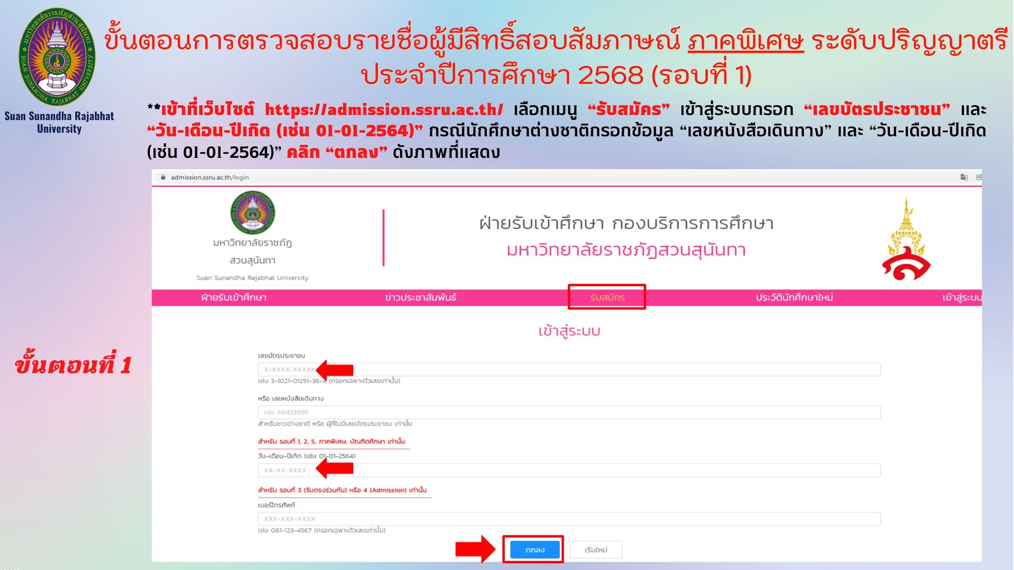 แจ้งนักศึกษา วิทยาลัยนิเทศศาสตร์ มหาวิทยาลัยราชภัฏสวนสุนันทา ประกาศรายชื่อผู้มีสิทธิ์สอบสัมภาษณ์ ภาคพิเศษ ระดับปริญญาตรี ประจำปีการศึกษา 2568 (รอบที่ 1) ผู้สมัครสามารถตรวจสอบรายชื่อได้ที่ https://admission.ssru.ac.th/login