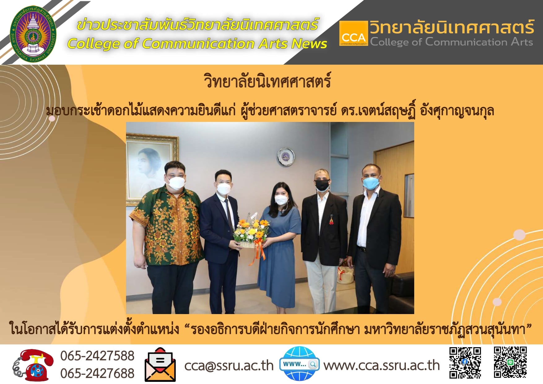 ผู้ช่วยศาสตราจารย์กัญภัส อู่ตะเภา รักษาราชการแทนคณบดีวิทยาลัยนิเทศศาสตร์ พร้อมด้วยผู้บริหาร และหัวหน้าสำนักงานมอบกระเช้าดอกไม้แสดงความยินดีแก่ ผู้ช่วยศาสตราจารย์ ดร.เจตน์สฤษฏิ์ อังศุกาญจนกุล ในโอกาสได้รับการแต่งตั้งตำแหน่ง “รองอธิการบดีฝ่ายกิจการนักศึกษา