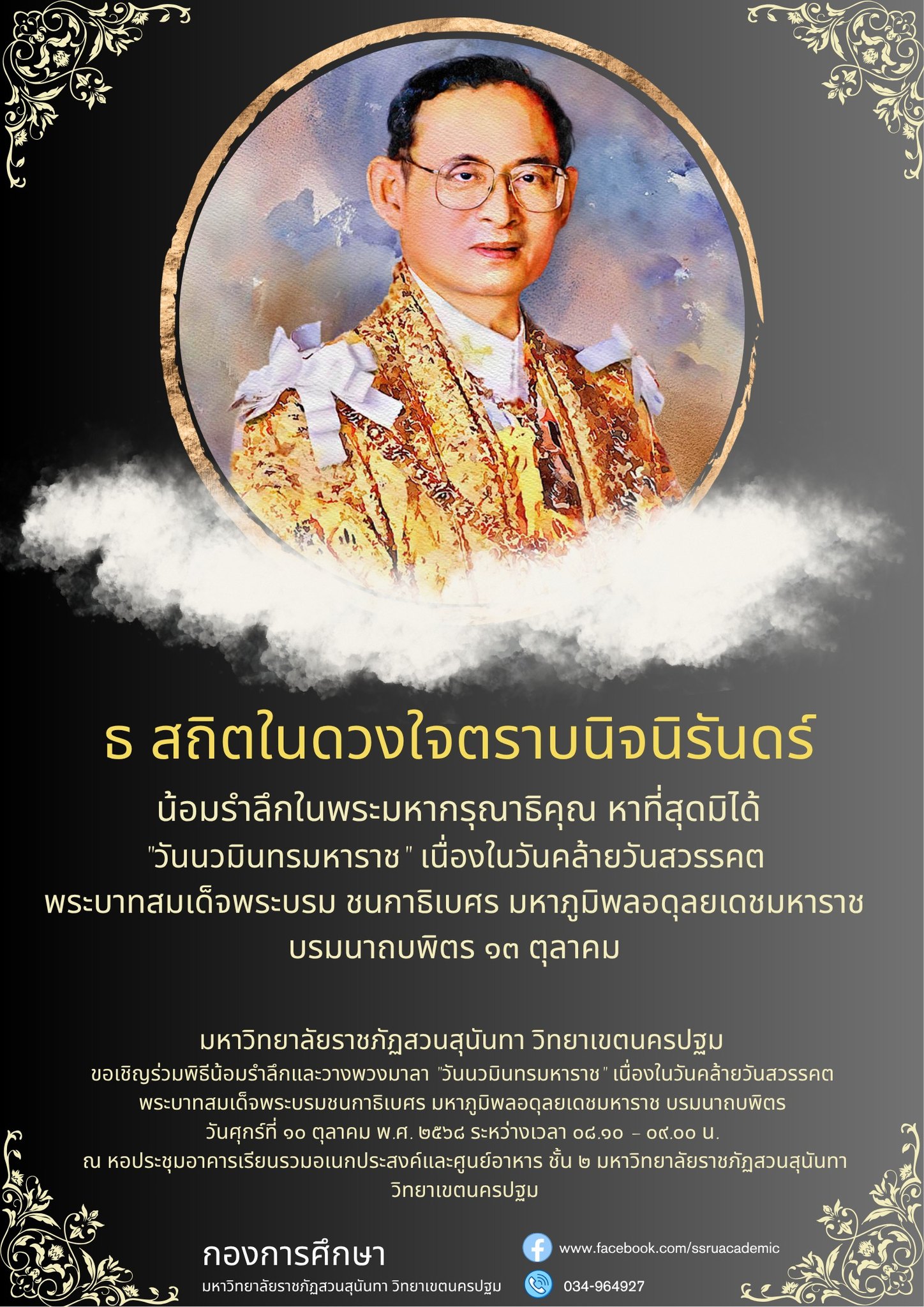 กองการศึกษา สำนักงานวิทยาเขตนครปฐม ขอเรียนเชิญท่านผู้บริหาร คณาจารย์ บุคลากร และนักศึกษา เข้าร่วมพิธีน้อมรำลึกในพระมหากรุณาธิคุณ เนื่องในวันคล้ายวันสวรรคต พระบาทสมเด็จพระบรมชนกาธิเบศร มหาภูมิพลอดุลยเดชมหาราช บรมนาถบพิตร 13 ตุลาคม ในวันศุกร์ที่ 10 ตุลาคม พ.ศ.2568 เวลา 8.10-9.00 น. ณ หอประชุมอาคารเรียนรวมอเนกประสงค์และศูนย์อาหาร ชั้น 2 มหาวิทยาลัยราชภัฏสวนสุนันทา วิทยาเขตนครปฐม พิธีเริ่มในเวลา 8.30 น.