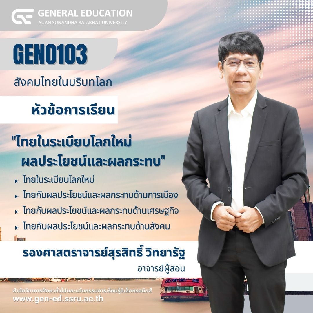 รองศาสตราจารย์ สุรสิทธิ์ วิทยารัฐ อาจารย์ผู้สอนได้นำเสนอถึง จัดการเรียนการสอนรายวิชา GEN0103 สังคมไทยในบริบทโลก (e-Learning) ไทยในระเบียบโลกใหม่ ไทยกับผลประโยชน์และผลกระทบด้านการเมือง ไทยกับผลประโยชน์และผลกระทบด้านเศรษฐกิจ และไทยกับผลประโยชน์และผลกระทบด้านสังคม