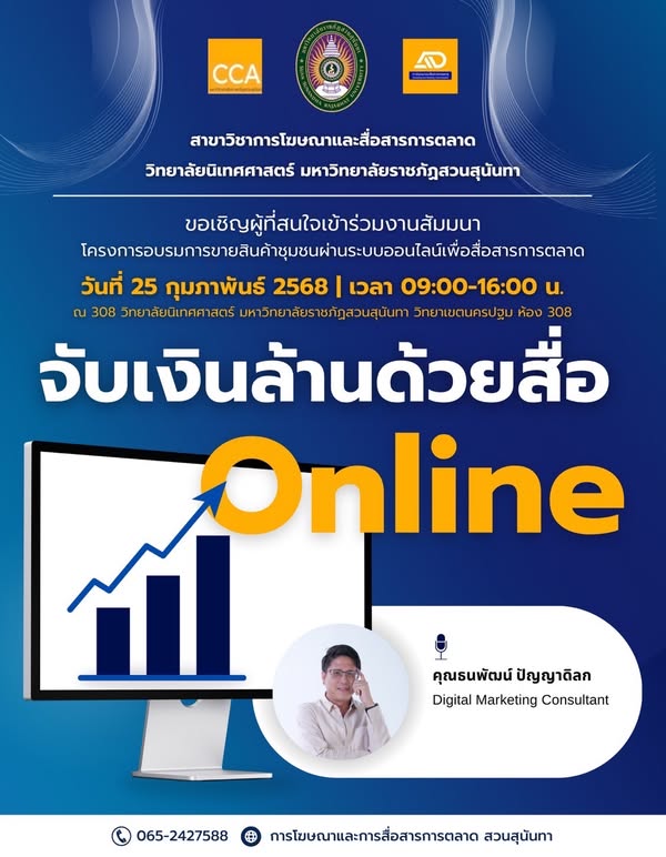 ขอเชิญผู้ที่สนใจเข้าร่วมโครงการอบรมการขายสินค้าชุมชนผ่านระบบออนไลน์เพื่อสื่อสารการตลาด โดยวิทยากรมืออาชีพ คุณธนพัฒน์ ปัญญาดิลก Digital Marketing Consultant ในหัวข้อ "จับเงินล้านด้วยสื่อ Online" วันที่ 25 กุมภาพันธ์ พ.ศ. 2568 เวลา 9.00-16.00 น. ณ ห้อง 308 วิทยาลัยนิเทศศาสตร์ มหาวิทยาลัยราชภัฏสวนสุนันทา วิทยาเขตนครปฐม