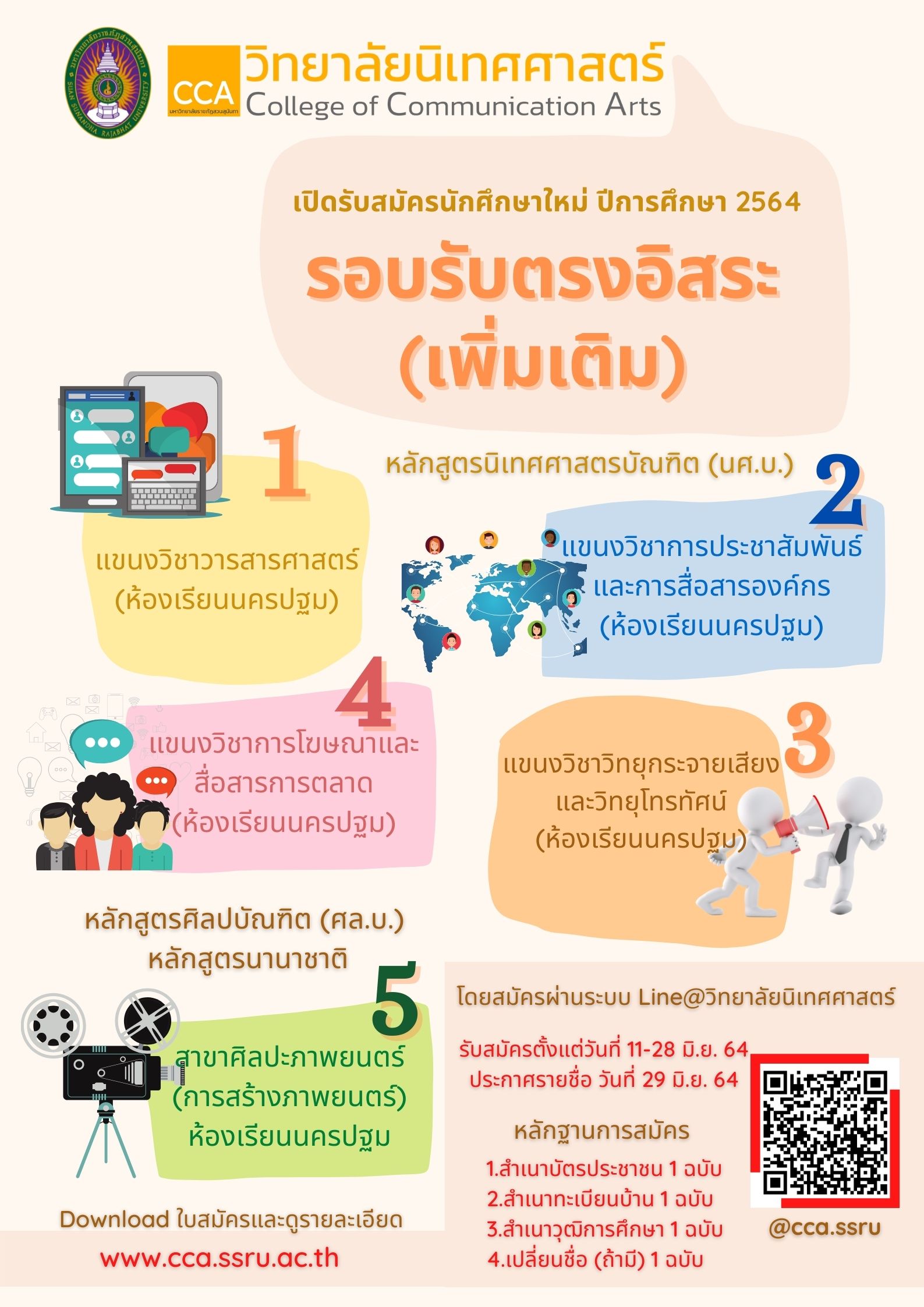 เปิดรับรอบสุดท้าย และท้ายสุด รอบรับตรงอิสระ (เพิ่มเติม) รับสมัครตั้งแต่วันที่ 11-28 มิ.ย. 64 นี้เท่านั้นนร้าาา **เปิดเฉพาะห้องเรียนวิทยาเขตนครปฐม**วิทยาลัยนิเทศศาสตร์ มหาวิทยาลัยราชภัฏสวนสุนันทา (CCA.SSRU) ยินดีต้อนรับน้องๆ ทุกคน ตอนนี้เปิดรับสมัครนักศึกษาระดับปริญญาตรี ประจำปีการศึกษา 2564