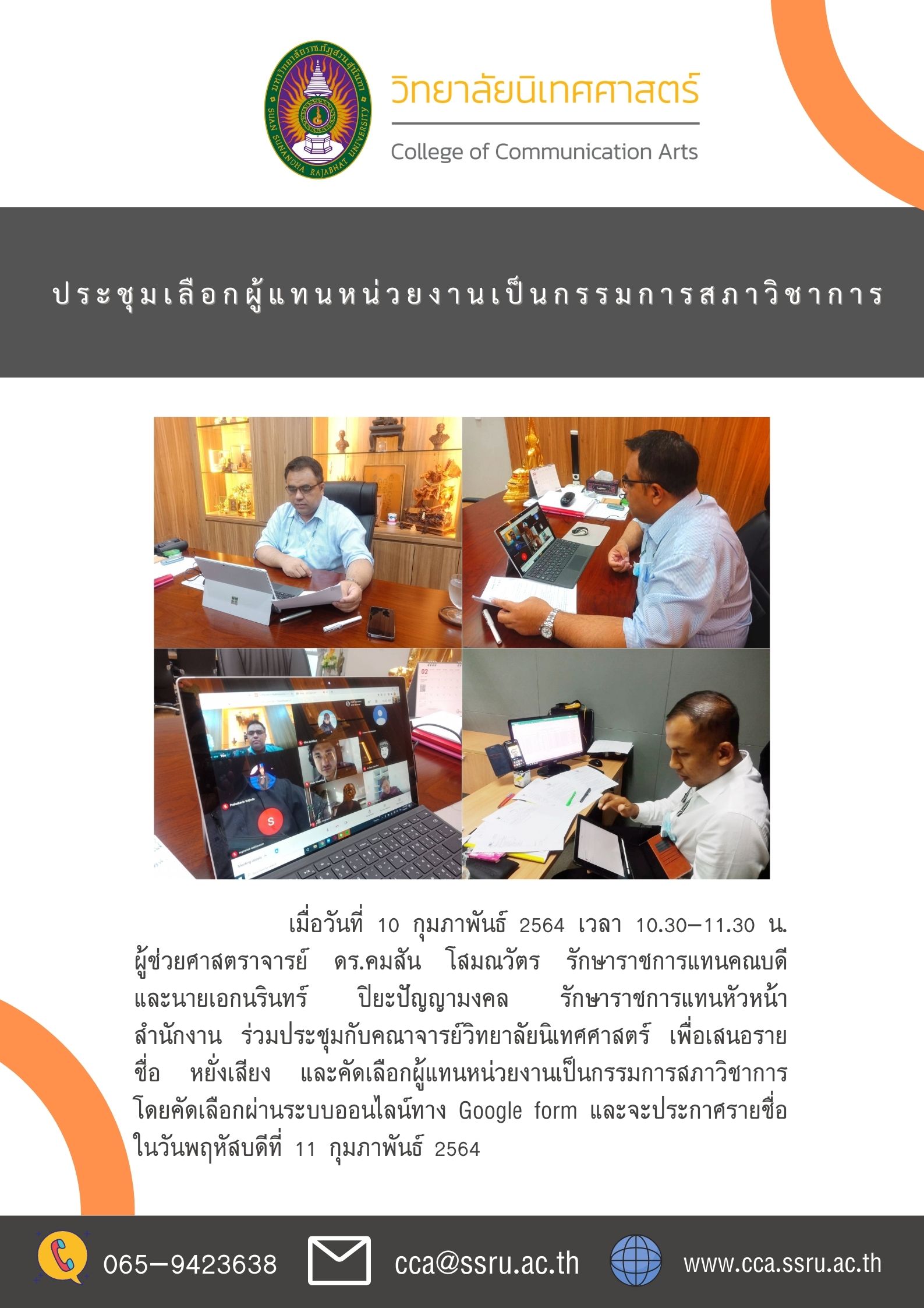 เมื่อวันที่ 10 กุมภาพันธ์ 2564 เวลา 10.30-11.30 น. ผู้ช่วยศาสตรจารย์ ดร.คมสัน โสมณวัตร รักษาราชการแทนคณบดี และนายเอกนรินทร์ ปิยะปัญญามงคล รักษาราชการแทนหัวหน้าสำนักงาน ประชุมร่วมกับคณาจารย์วิทยาลัยนิเทศศาสตร์ เพื่อเสนอรายชื่อ หยั่งเสียง และคัดเลือกผู้แทนหน่วยงานเป็นกรรมการสภาวิชาการ โดยคัดเลือกผ่านระบบออนไลน์ทาง Google Form และจะประกาศรายชื่อในวันพฤหัสบดีที่ 11 กุมภาพันธ์ 2564