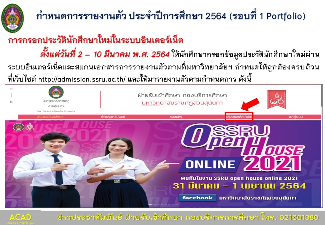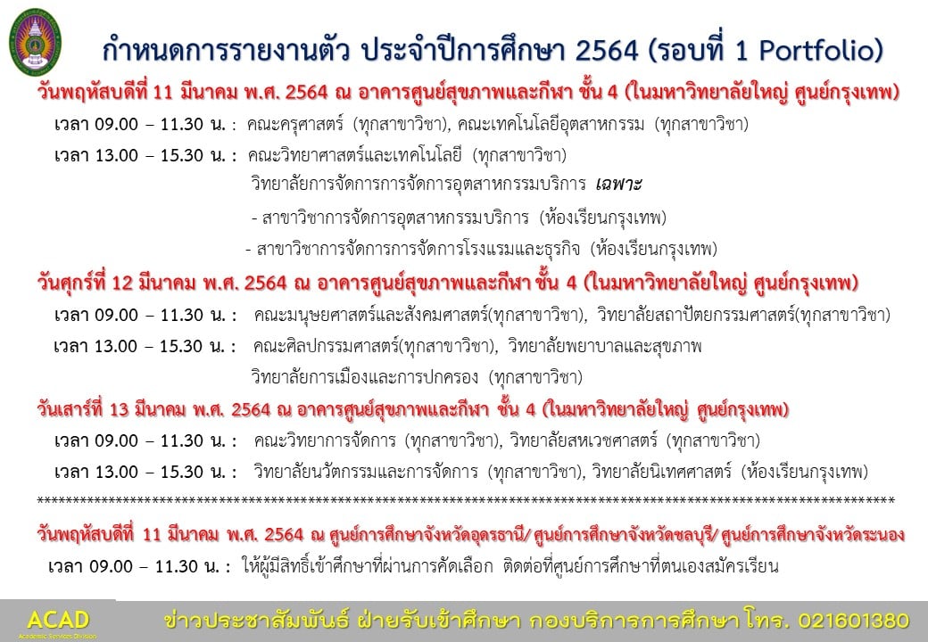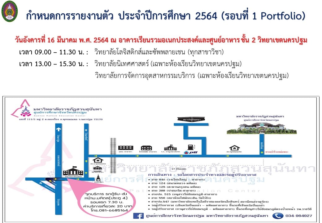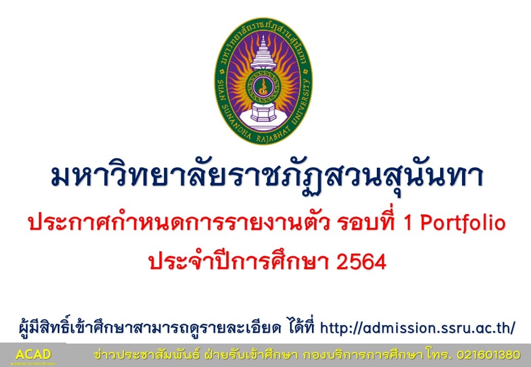 มหาวิทยาลัยราชภัฏสวนสุนันทา ประกาศกำหนดการรายงานตัว รอบที่ 1 (Portfolio) ประจำปีการศึกษา 2564