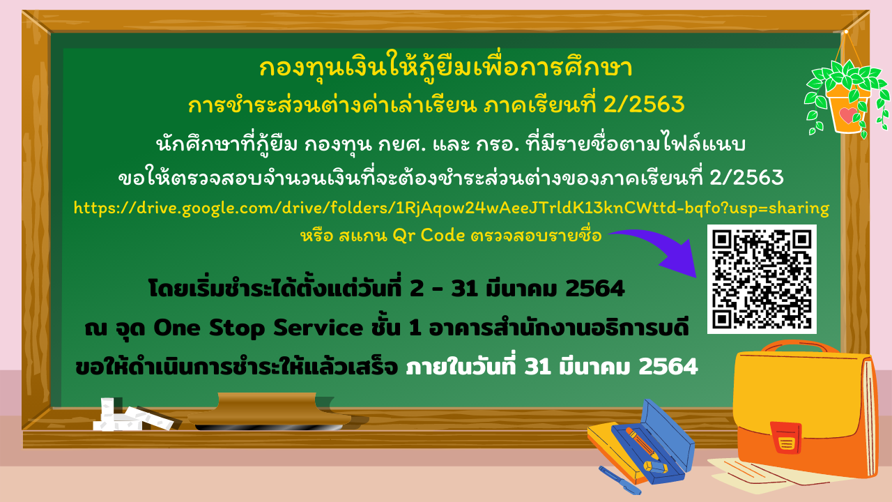 นักศึกษาที่กู้ยืม กองทุน กยศ. และ กรอ. ที่มีรายชื่อตามไฟล์แนบ ขอให้ตรวจสอบจำนวนเงินที่จะต้องชำระส่วนต่างของภาคเรียนที่ 2/2563