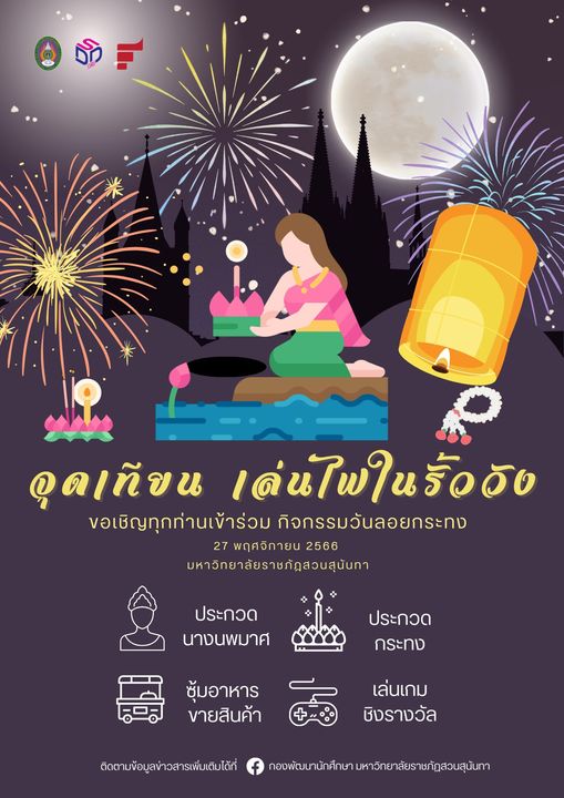 Loi Krathong this year Student Development Division Invite everyone to join the event "Light Candles and Play with Fire in the Palace Fence" on 27 November. There will be many activities such as the Miss Noppamas contest. Krathong contest Food booths sell products and play many games. Those interested in applying for the contest
