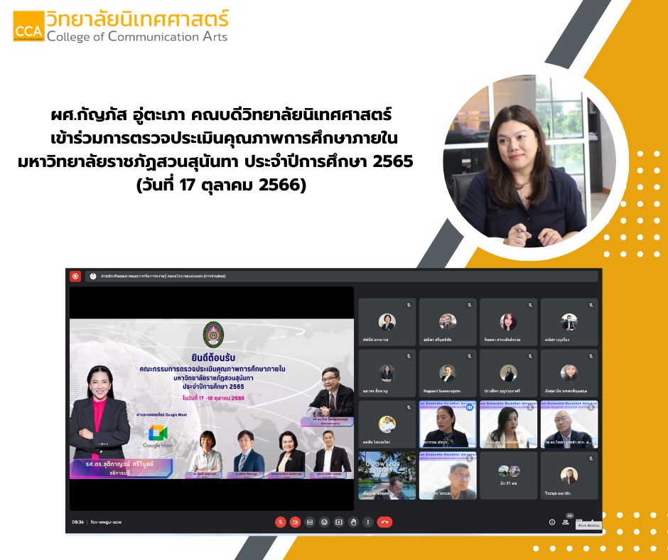 วันที่ 17 ตุลาคม 2566 เวลา 08.30 น. ผู้ช่วยศาสตราจารย์ กัญภัส อู่ตะเภา คณบดีวิทยาลัยนิเทศศาสตร์ เข้าร่วมการตรวจประเมินคุณภาพการศึกษาภายใน มหาวิทยาลัยราชภัฏสวนสุนันทา ประจำปีการศึกษา 2565 จัดโดยกองนโยบายและแผน สำนักงานอธิการบดี โดยมีรองศาสตราจารย์ ดร.ชุติกาญจน์ ศรีวิบูลย์ อธิการบดีมหาวิทยาลัยราชภัฏสวนสุนันทา เป็นประธานกล่าวต้อนรับคณะกรรมการผู้ทรงคุณวุฒิและรับการตรวจประเมินคุณภาพการศึกษา ในรูปแบบการประชุมผ่านระบบออนไลน์ Google Meet