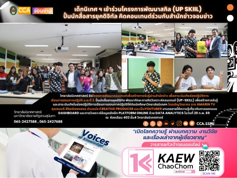 วิทยาลัยนิเทศศาสตร์ จัดโครงการพัฒนาคอนเทนต์เพื่อสร้างการรับรู้ผ่านสำนักข่าว เพื่อสาระบันเทิงช่องปฏิบัติการเรียนการสอนภาคปฏิบัติ ระยะที่ 2 ปั้นนักสื่อสารยุคดิจิทัล พัฒนาทักษะการคิดวิเคราะห์คอนเทนต์ (Up-Skill) เพื่อสร้างการรับรู้และสาระบันเทิงในช่องปฏิบัติการเรียนการสอนภาคปฏิบัติให้กับนักศึกษาวิทยาลัยนิเทศฯ โดยเชิญวิทยากร จาก Amarin TV คุณธนบดี สิริพณิชพงศธร ตำแหน่ง Creative Producer และเป็นyoutuber มาบรรยายให้ความรู้เกี่ยวกับการออกแบบ Dashboard และการวิเคราะห์ข้อมูลเชิงลึก Platform Online ด้วย DATA Analytics ในวันที่ 20 ก.พ. 69 ที่ผ่านมา ณ ห้องเรียน 402 ชั้น4 วิทยาลัยนิเทศศาสตร์ มหาวิทยาลัยราชภัฏสวนสุนันทา วิทยาเขตนครปฐม