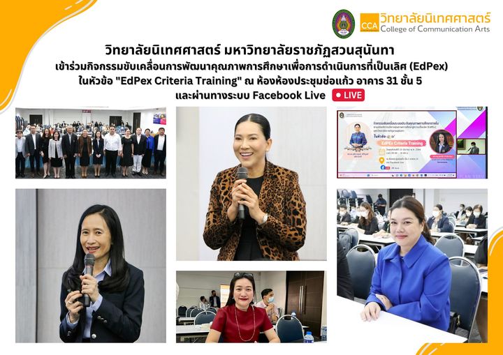 College of Communication Arts Participated in the activities to drive education quality development for excellence (EdPex), Suan Sunandha Rajabhat University. and attended the training on the topic "EdPex Criteria Training" which was honored by Assoc. Prof. Usanee Khamprakob, Vice President of Chiang Mai University, was a speaker, with Assoc. Prof. Dr. Chutikan Sriwiboon, the President, presided over the opening speech at Cho Kaew Conference Room, Building 31, 5th floor and via the Facebook Live system.
