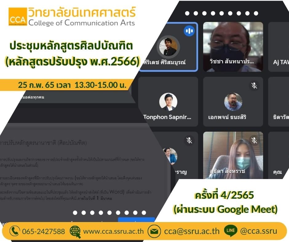 เมื่อวันที่ 25 กุมภาพันธ์ 2565 เวลา 13.30-15.00 น. ผู้ช่วยศาสตราจารย์ วิชชา สันทนาประสิทธิ์ รองคณบดีฝ่ายวิชาการ พร้อมด้วยคณาจารย์ประจำหลักสูตรศิลปบัณฑิต ร่วมประชุมหลักสูตรศิลปบัณฑิต (หลักสูตรปรับปรุง พ.ศ. 2566) ครั้งที่ 4/2565 ผ่านระบบ Google Meet และได้มีการเสนอร่างหลักสูตรศิลปบัณฑิต (หลักสูตรนานาชาติ) ฉบับสมบูรณ์ เพื่อเตรียมเข้าสู่การวิพากษ์หลักสูตรในเดือนมีนาคม
