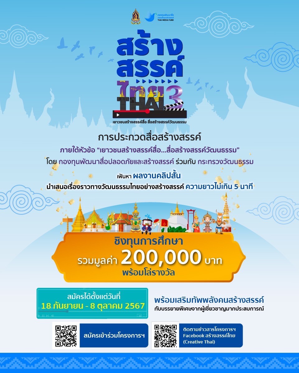 กองทุนพัฒนาสื่อปลอดภัยและสร้างสรรค์ ขอเชิญชวนเยาวชนอายุไม่เกิน 25 ปี ประกวดคลิปวิดีโอเชิงวัฒนธรรม ในหัวข้อ “เยาวชนสร้างสรรค์สื่อ สื่อสร้างสรรค์วัฒนธรรม” ภายใต้โครงการ “สร้างสรรค์ไทย 3” ชิงเงินรางวัล 2 แสนบาท รวม 7 รางวัล ประกอบด้วย รางวัลชนะเลิศ จำนวน 1 รางวัล รางวัลละ 50,000 บาท, รางวัลรองชนะเลิศอันดับหนึ่ง จำนวน 1 รางวัล รางวัลละ 40,000 บาท, รางวัลรองชนะเลิศอันดับสอง จำนวน 2 รางวัล รางวัลละ 30,000 บาท, รางวัลชมเชย จำนวน 2 รางวัล รางวัลละ 10,000 บาท และรางวัลขวัญใจมหาชน (Popular Vote) จำนวน 1 รางวัล รางวัลละ 30,000 บาท โดยทุกรางวัลจะได้รับโล่รางวัลจากกองทุนพัฒนาสื่อปลอดภัยและสร้างสรรค์ เปิดรับสมัครตั้งแต่วันที่ 18 กันยายน ถึง 8 ตุลาคม 2567