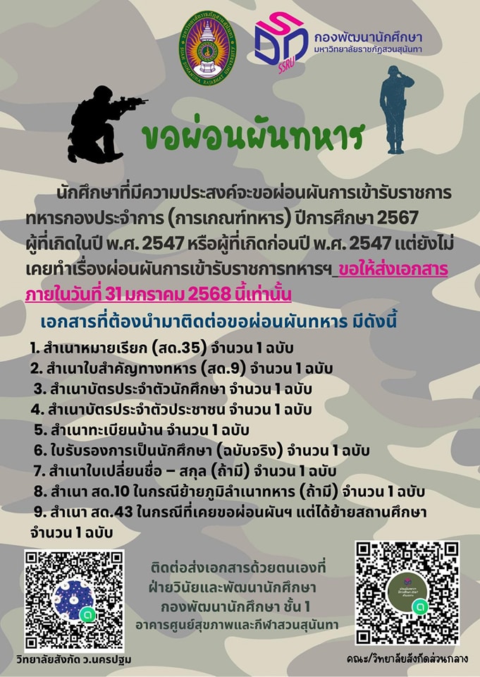 มหาวิทยาลัยราชภัฏสวนสุนันทา โดย กองพัฒนานักศึกษา ฝ่ายวินัยและพัฒนานักศึกษา กำหนดรับเอกสารขอผ่อนผันการเข้ารับราชการทหารกองประจำการ (การเกณฑ์ทหาร) ปีการศึกษา 2567 สำหรับนักศึกษาที่เกิดในปี พ.ศ. 2547 หรือปี พ.ศ. 2547