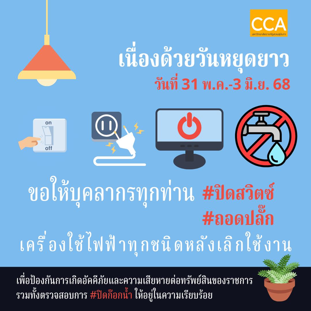 วิทยาลัยนิเทศศาสตร์ มหาวิทยาลัยราชภัฎสวนสุนันทา ขอให้บุคลากรทุกท่าน #ปิดสวิตซ์ และถอดปลั๊ก เครื่องใช้ไฟฟ้าทุกชนิดหลังเลิกใช้งาน เพื่อป้องกันการเกิดอัคคีภัย และเกิดความเสียหายต่อทรัพย์สินของราชการ รวมทั้งตรวจสอบการ #ปิดก๊อกน้ำ ให้อยู่ในความเรียบร้อย